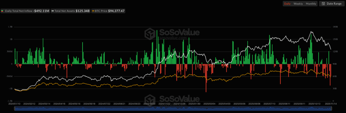 哈佛调仓之际,全美比特币现货ETF正遭遇创纪录资金外流。11月13日单日净流出达8.69亿美元,创历史第二高纪录。次日净流出规模仍达4.92亿美元,机构投资者在比特币冲击94,000美元关口时纷纷减仓避险。