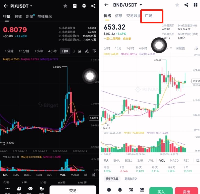 如果你想要看盘,币安的界面跟Bitget的界面是没有差太多的,顶多是差在上方选单的部分,币安多了一个广场。就是你可以看到其他人到底是怎么看待这个币的,但是我觉得这个差异并不大。