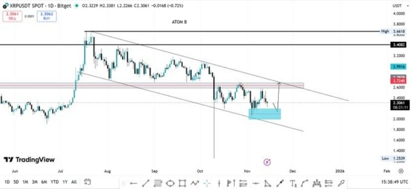 XRP测试下降通道内关键需求区,可能反弹至2.72-2.78美元区域,若支撑失效或下探。来源:@aT0m_B via X
