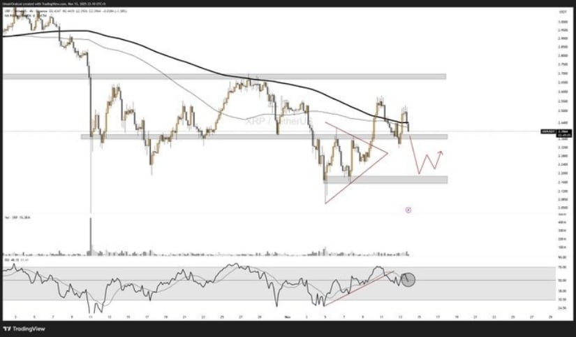 截至发稿,XRP交易价格约为2.306美元,24小时跌幅2.1%,单日交易量突破77亿美元。尽管短期疲软,XRP仍处于自10月初主导价格走势的宽幅下降通道内。该通道下轨与2.23-2.30美元历史关键需求区重合——该区域曾多次展现强劲买盘兴趣。