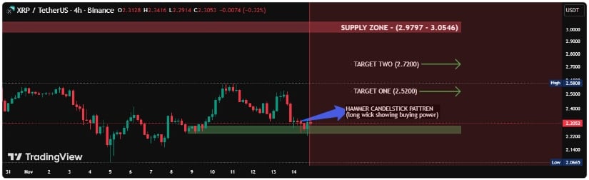 XRP在2.24-2.28美元需求区形成锤形反转,潜在上行目标2.52与2.72美元。来源:coinpediamarkets on TradingView