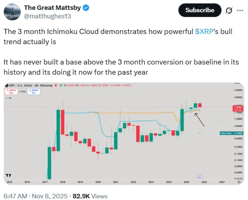 XRP展现前所未有的强势,连续一年稳居3个月一目均衡云上方。来源:@matthughes13 via X