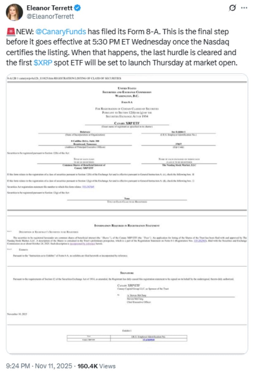 看涨情绪再添助力——金丝雀XRP ETF(XRPC)在向SEC提交8-A表格后,即将登陆纳斯达克。记者Eleanor Terrett报道称这是最后监管关卡,该ETF将在纳斯达克认证后于美东时间下午5:30生效,周四早盘开始交易,成为美国首只面向投资者的现货XRP ETF。