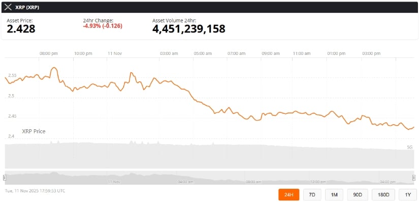 截至发稿,XRP报价2.42美元,24小时跌幅4.93%。来源:Brave New Coin XRP价格