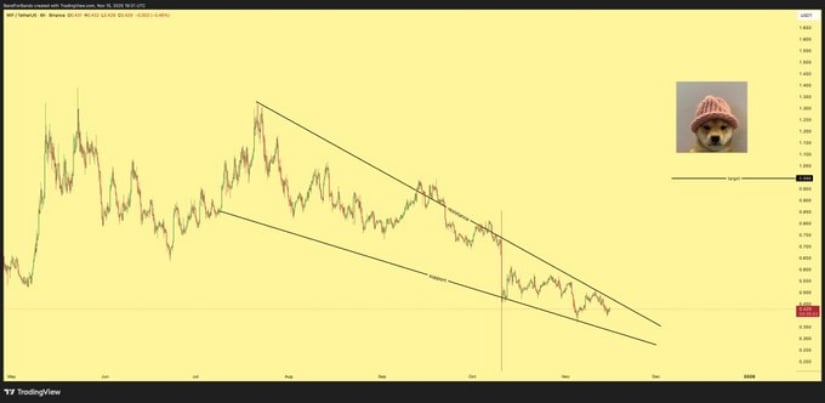 分析师BFB(@BFB)约15小时前在X平台发布的更新中指出,WIF作为长期存在的模因币,当前图表中正处于下降楔形结构内。