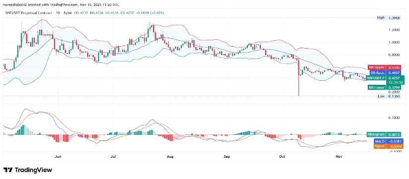 标准技术分析工具显示,WIF在布林带下轨附近交投,此前已从1.40 USDT附近峰值经历数月下跌。布林带收窄表明波动率下降,通常预示扩张阶段临近,但方向性尚未确立。