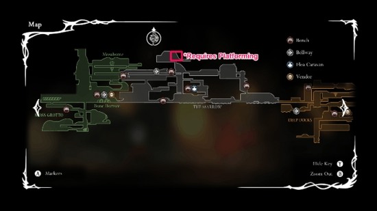 其中一只迷途跳蚤位于髓骨洞窟区域最高处,该区域在保存进度前不会显示在地图上。此区域为平台跳跃关卡,设有多重障碍与敌对虫族阻挡去路。