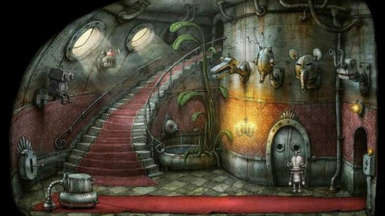 进来一看,应该是个类似电梯的房间,墙上有几个看不懂的符号,最上面有个摄像头会跟着你转动。右边大盆植物旁有个小门打不开,左边这个开关又是个谜题。原来墙上的符号就是楼层的图形,比如地下一楼(-1)就是那个类似八芒星的图案。在大盆的植物花盆的左边可以点击,会挖出一小点土,然后电梯里有个小门开了,一只洗尘器跑出来把泥土吸干净又跑回去了,再弄点土在地上,吸尘器又跑出来了,抓住吸尘器,然后会从他身上抖出电梯开关上掉了的一个小灯,把小灯安到电梯开关的右上角,这时可以弄出0楼的符号了。(这里不要学我,原来0楼就是通向广场的路,就是先前铁管下去的地方)出去了还回不去了,只能再次从广场的空水池里绕路找MM加油坐电梯再走一遍。)玩到这里卡住了。观察了一会,墙上的二楼的符号被树叶挡住了看不见,把身子拉长,再点树叶,就可以拔开树叶,看到二楼的符号了,原来是个五角星图案。把电梯弄成五角星图案就可以上2楼了。
