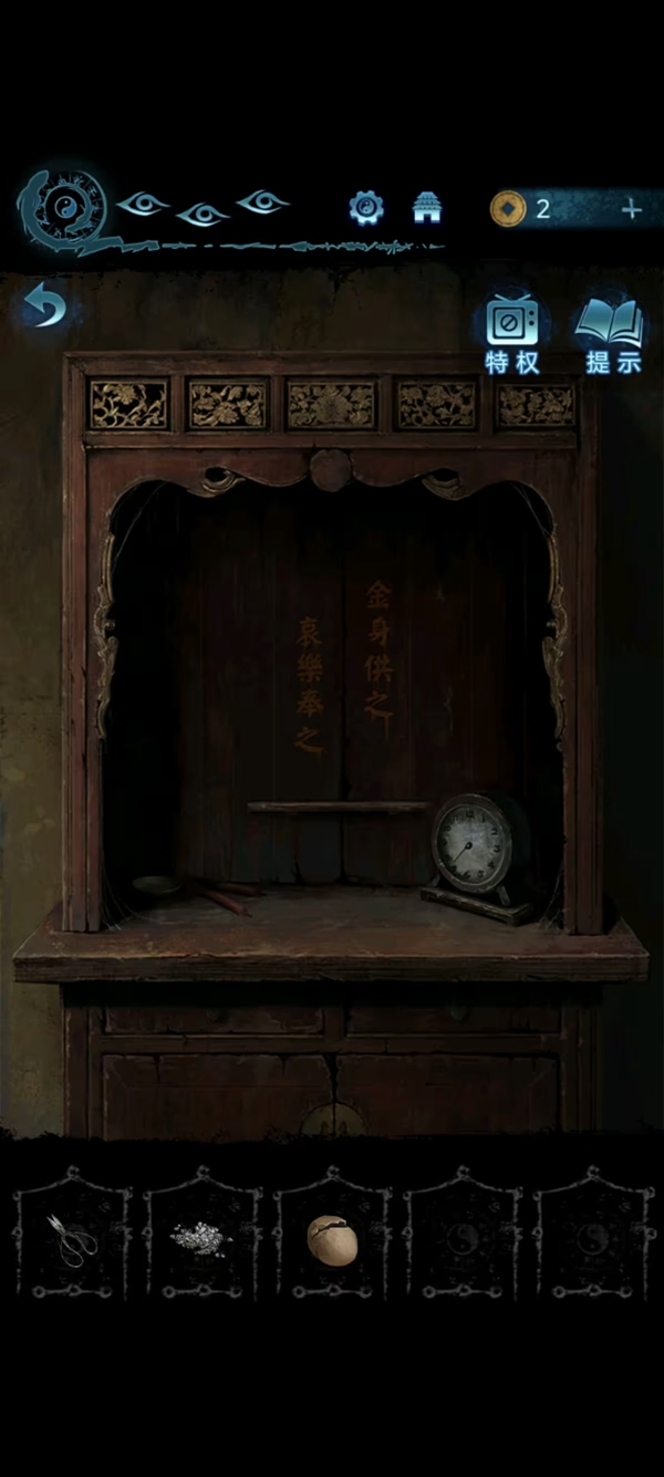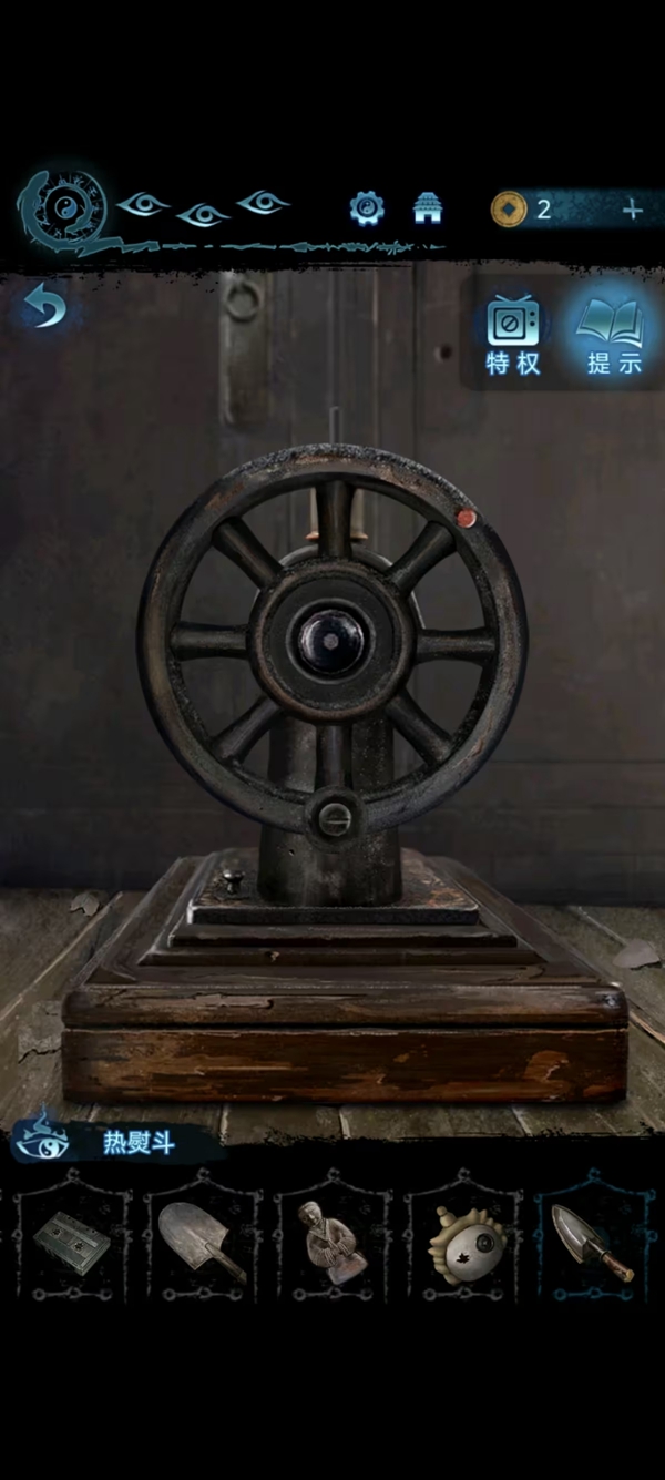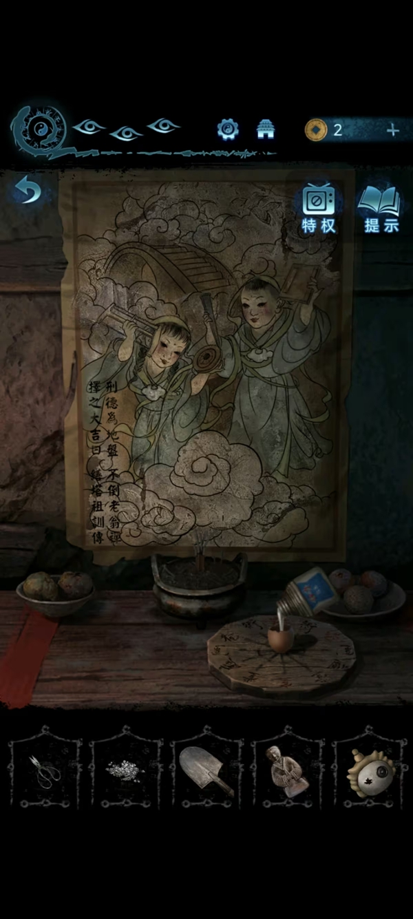 6、查看缝纫机,录音带往下拉可知顺序,如下图转动可获得胶水,下地下室用鸡蛋壳、胶水、沙粒、布娃娃头制成不倒翁,获得金箔。上去把金箔贴到神台上,获得布帛,到灶房桌子上熨烫升级为帛画(2、3、4、2秒,看文字消失图像明显就可以)。