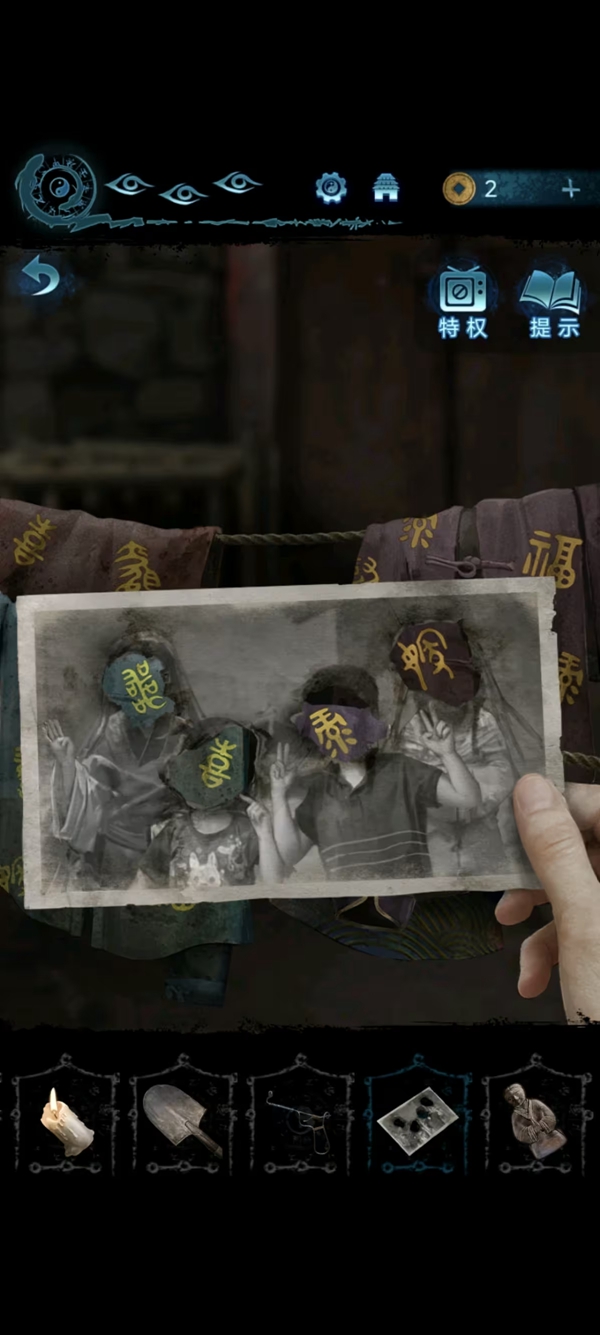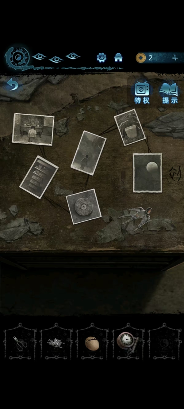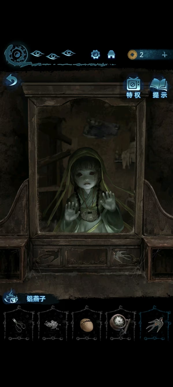 2、从窗口进入房间,先从神台拿闹钟,然后到桌子上把照片如图摆放,获得燕子,嵌入梳妆台,和小鬼玩你拍一我拍一,获得链条和藏宝图。