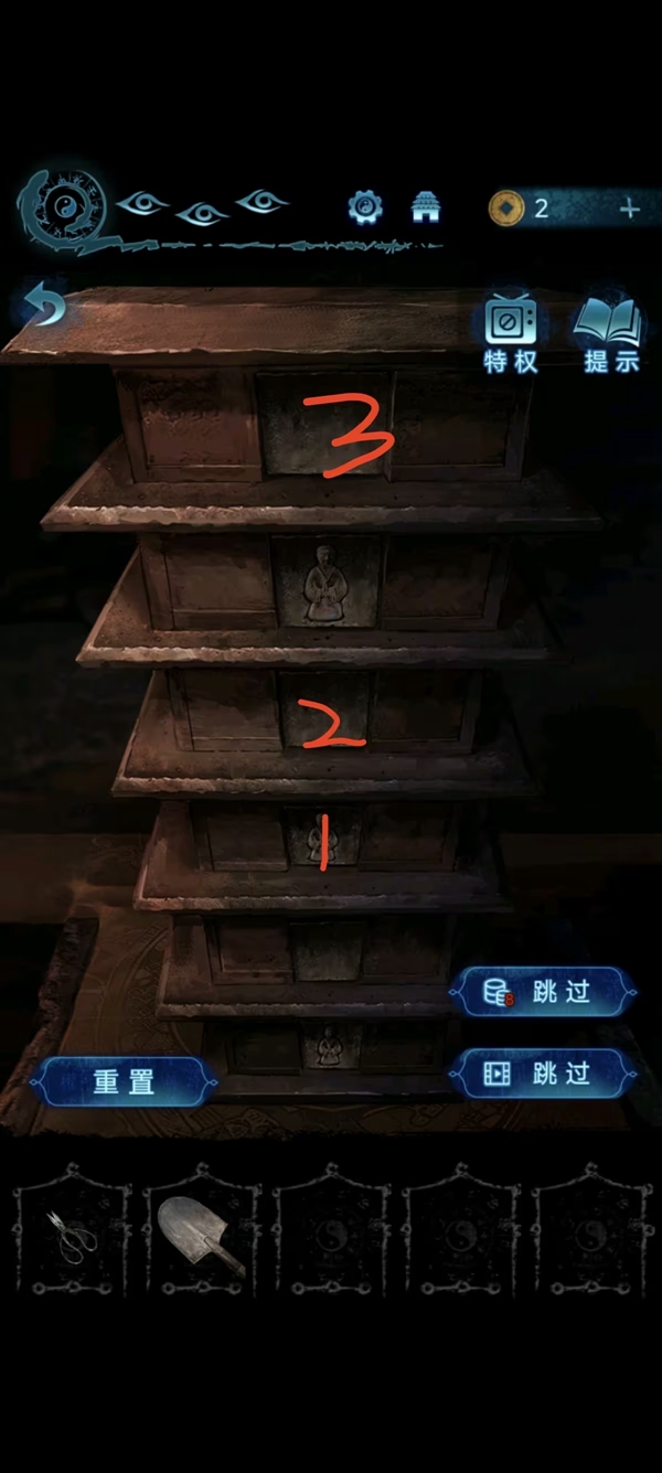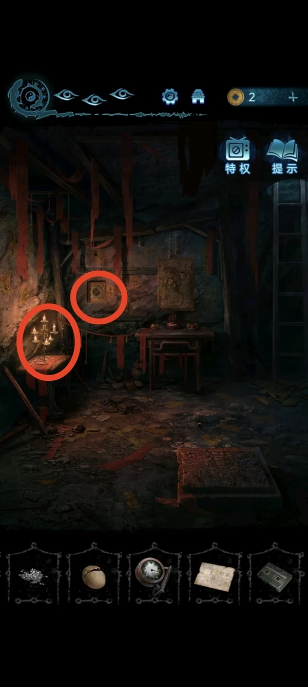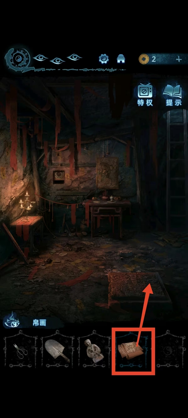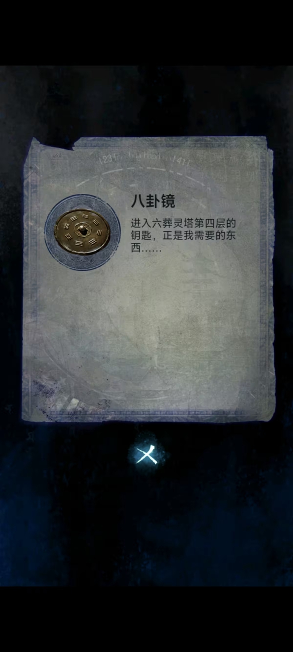 7、下地下室,把帛画放在台上,出现塔,把小人补齐,按照图中步骤打开机关,中途卡住用铁锹撬开,获得八卦镜,第三章完。