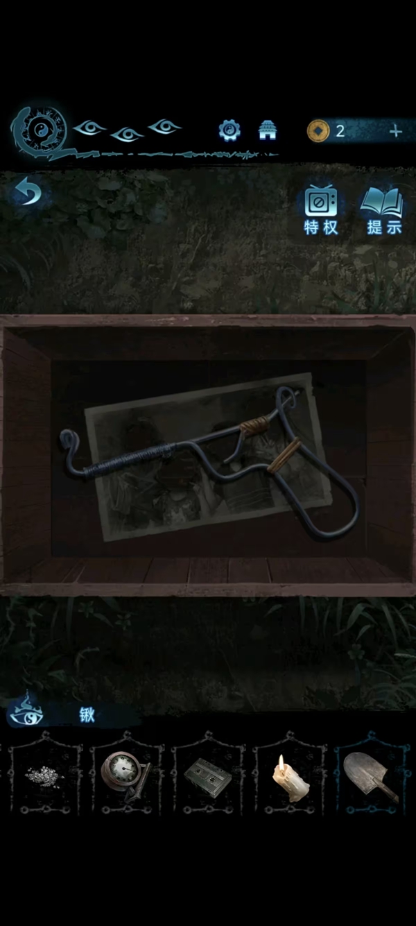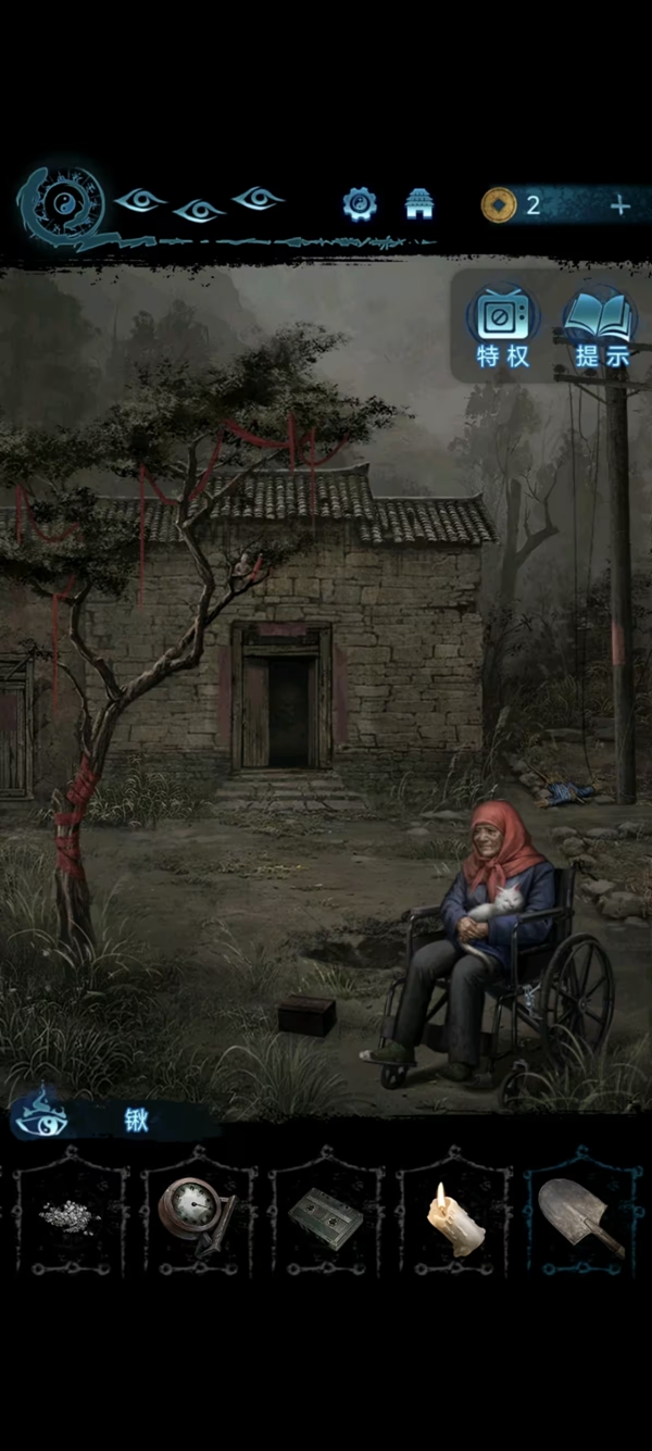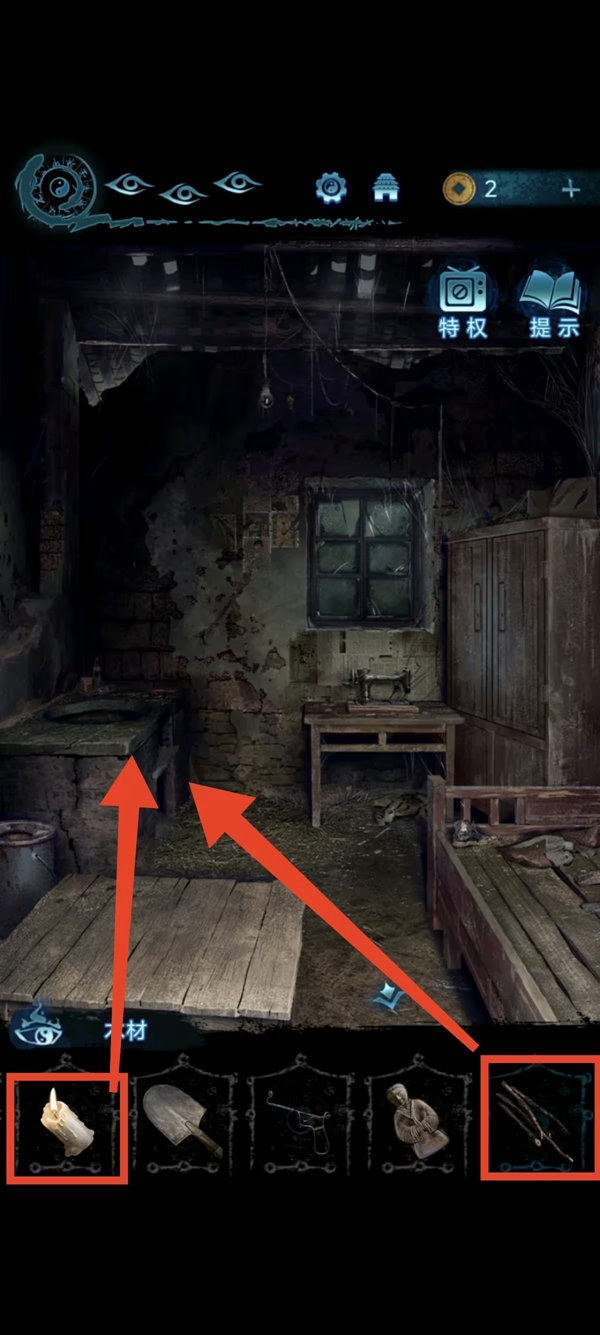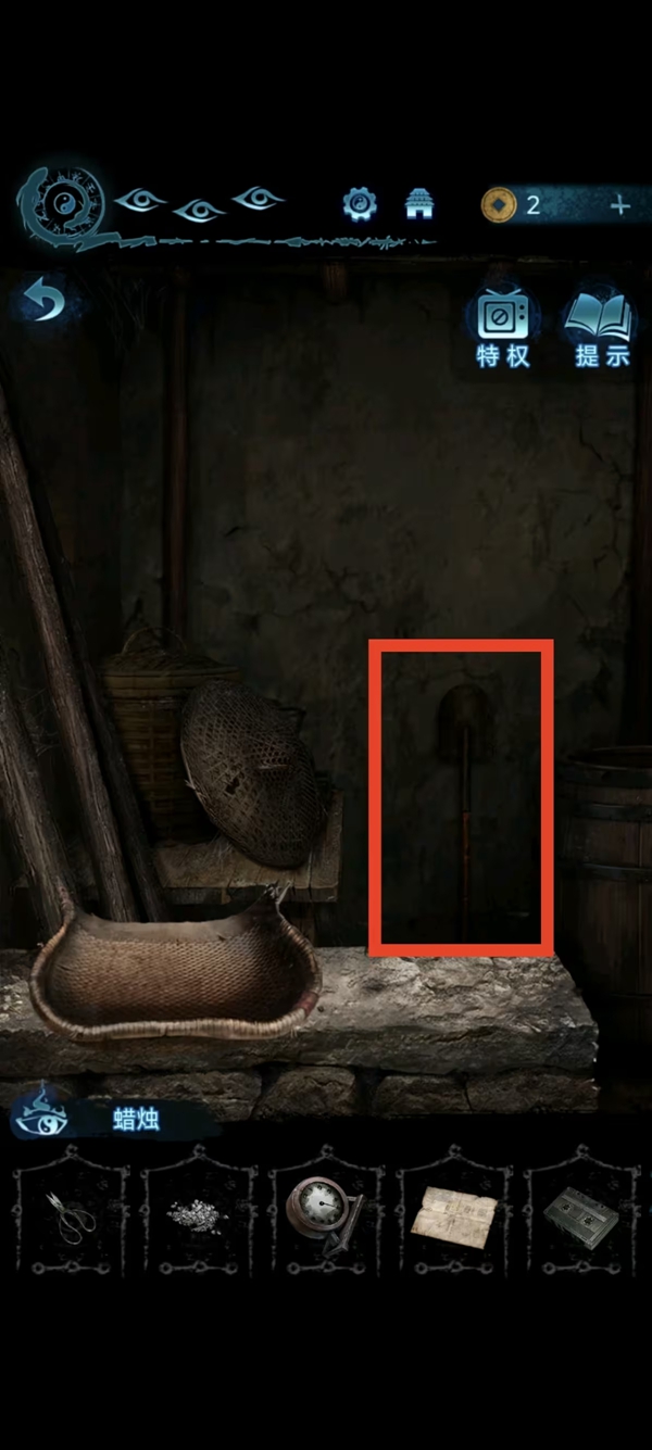 4、进入地下室,拿走图中的蜡烛和盘子,找刘姥姥给你换个新盘子,然后在院子右边获得铁锹,左边拾取木材,离开院子,在藏宝图所示地方挖“宝藏”,获得铁丝和线索。
