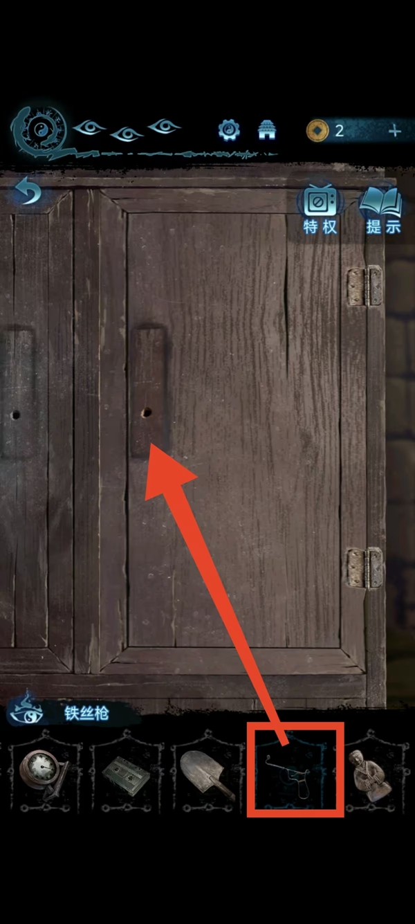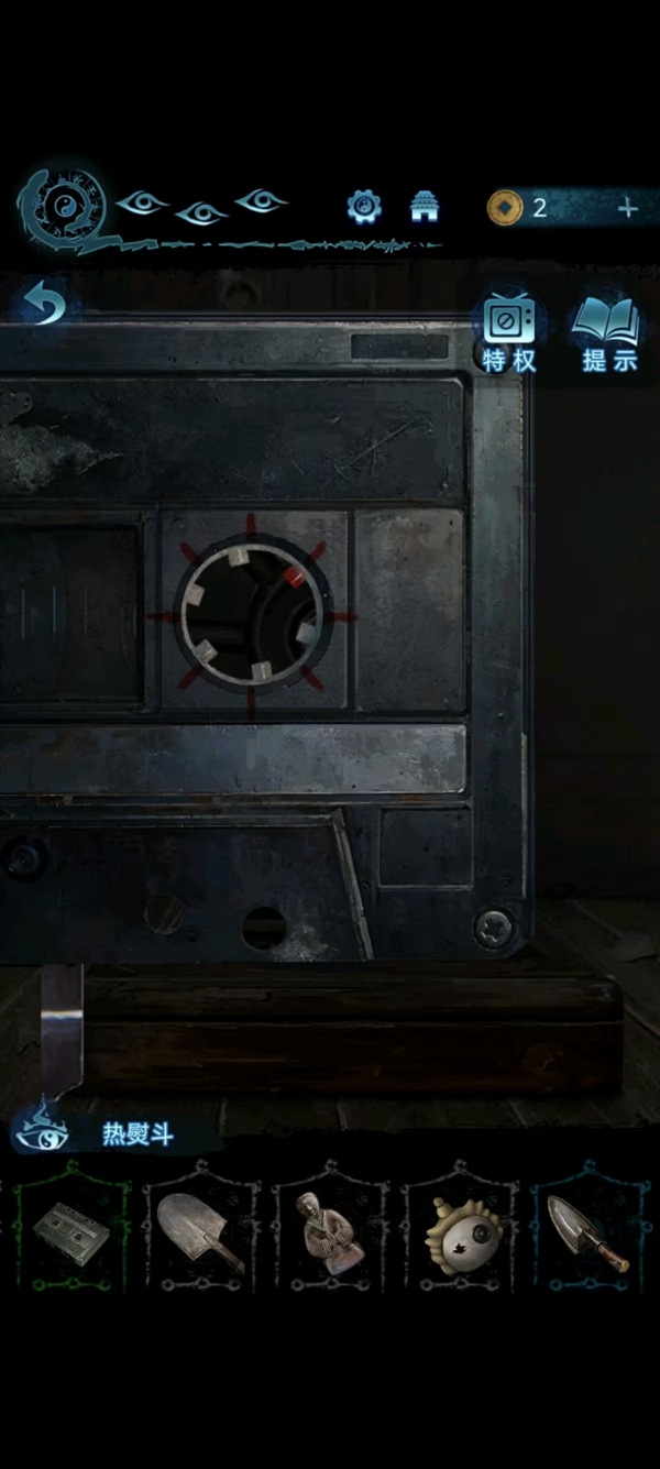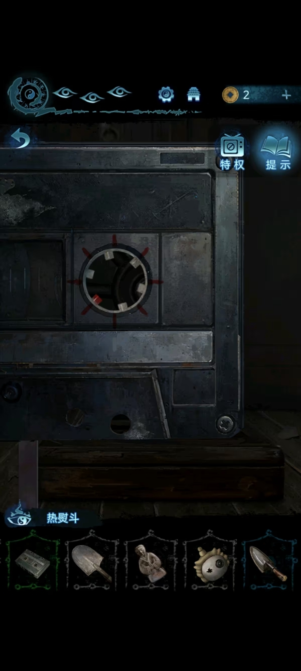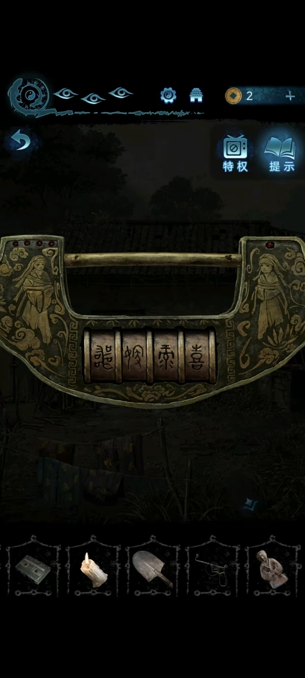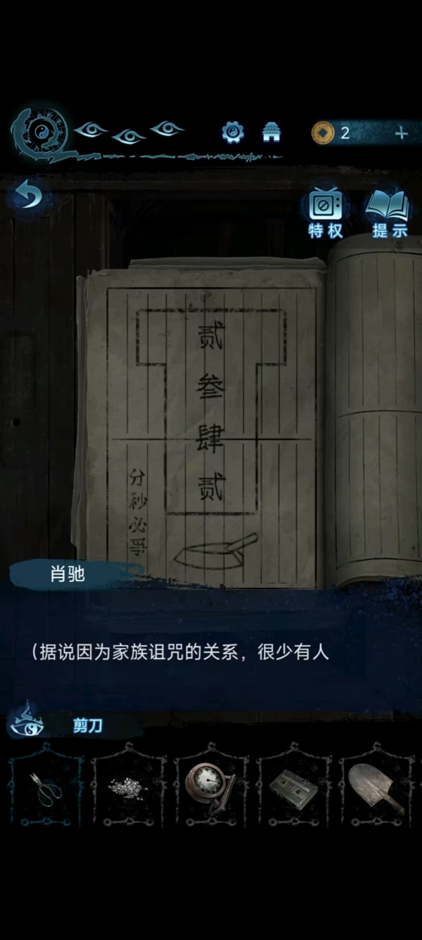 5、用铁锹顺便把树上的铜人薅下来,进院子到寿衣用合影看获得门上密码,按照图中所示把门打开。把木材和蜡烛丢进灶台生火,用铁丝打开柜子,获得熨斗,剪刀剪开布偶,获得一个布偶头,翻开书看看线索。