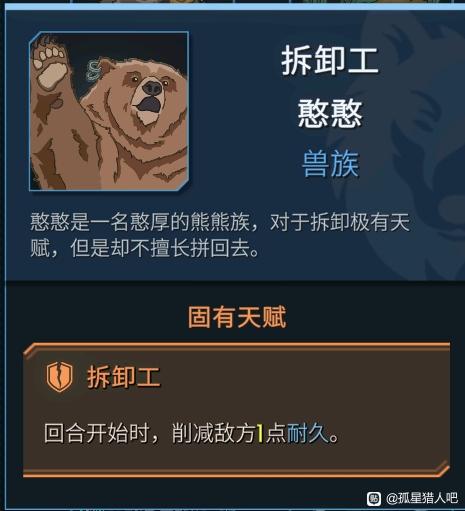 拆卸工,能力朴实无华,但却又非常好用,很多敌人的耐久度经过专门设计,正常情况下打满也不可能在关键的爆发回合将其瘫痪,有了它就可以在关键回合将其击晕,完美规避风险,关键时刻减一波耐久也是很关键的控制,与部分与耐久有关的部件和宝物适配性也很不错,可惜就是目前并没有专武