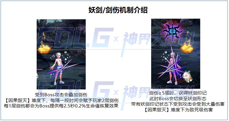 · 【因果毁灭】难度下,每隔一段时间赋予玩家2层剑伤,且拥有妖剑标记时受到攻击必死