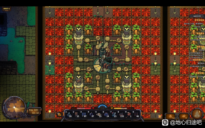首先是万源之本——燃料自动生产机,很多人觉得火电没办法做到自动化所以会被地热淘汰,其实是错误的,有了燃料自动生产机,你就有数不尽的燃料,而且用火电开矿是远比地热开矿容易的,主要体现在不用拉电线杆,不用额外分配电力,并且由于矿是有限的,只要你算好燃料(用碎屑的话简单来算就是消耗1块碎屑,每台矿机可以采集15块矿),采完之后就完全不用管,更重要的是,火电开矿和运输塔运矿很搭!也为后续的全自动化打下了基础,话不多说,上图,原理为通过灼热地板烫掉长出的藤蔓然后用收集器收集最后运往跨层运输塔,图二传送带额外搭出去一路是为了就地供火电燃料(运输塔什么的也需要电)只造了两块燃料生产机,产能非常恐怖,供应12000电力的火电是没有问题的。