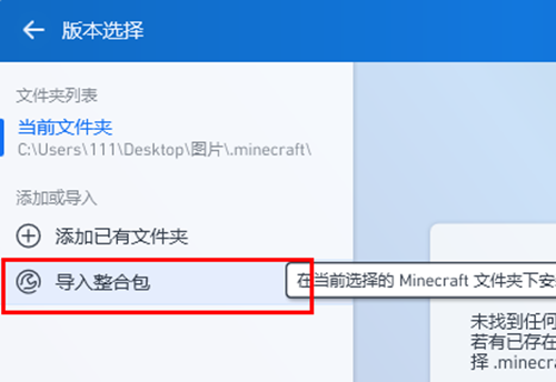2、进入"版本选择"页面之后,继续选择左下角的"导入整合包"。