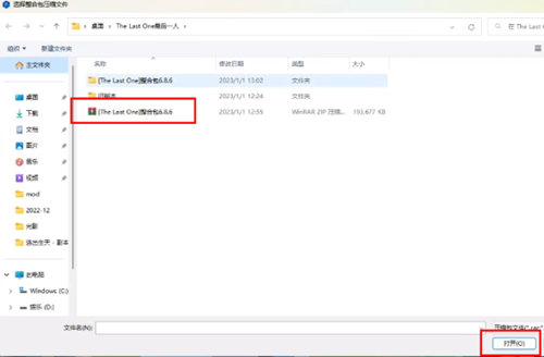 3、在弹出的文件选择对话框中,选择需要导入的整合包文件,点击"打开"。