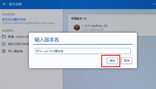 4、最后会弹出一个"输入版本名"的框框,只要版本名填进去就可以了,点击"确定"然后就成功导入整合包了。