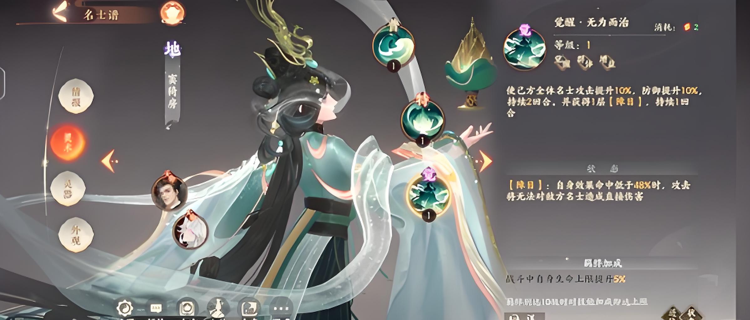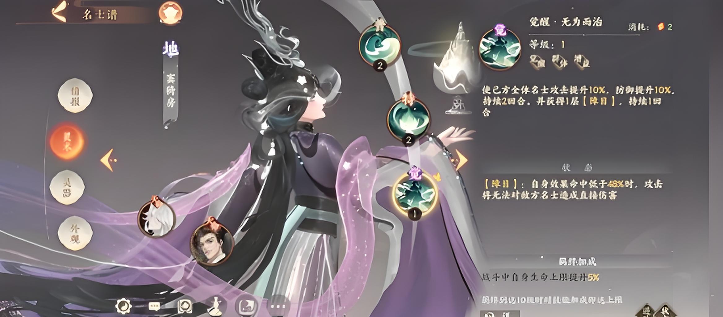 2、无争每层减30%攻击与45%效果命中最多叠加3层,行动后减1层,实战需紧盯敌方高攻名士,优先放特性避免自动战斗。