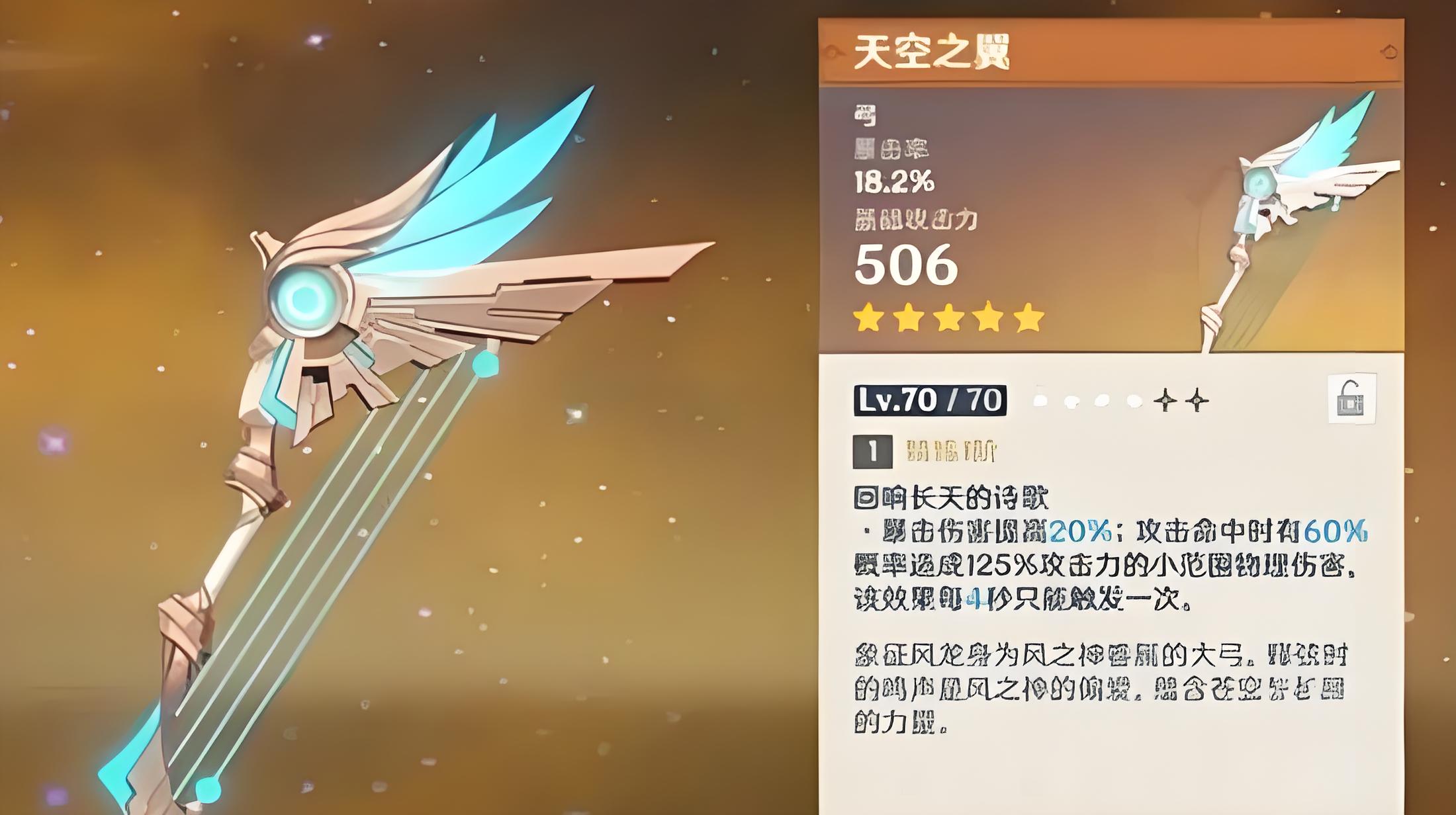 4、天空之翼获取难度低,作为常驻五星武器,满级基础攻击力五百零六,提供十八点二暴击率与二十暴击伤害加成。