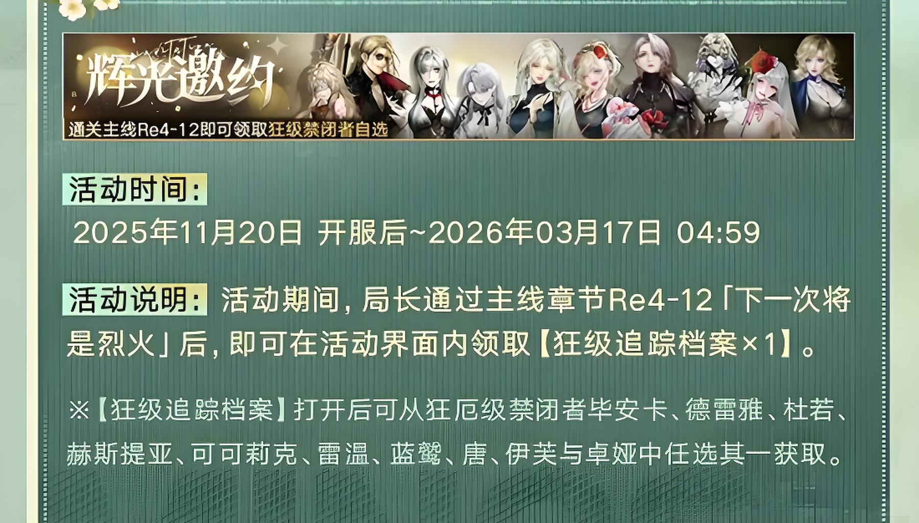 1、活动时间从2025年11月20日开服后至2026年3月17日5点,玩家通关主线章节Re4至12即可领取狂级追踪档案开启自选。