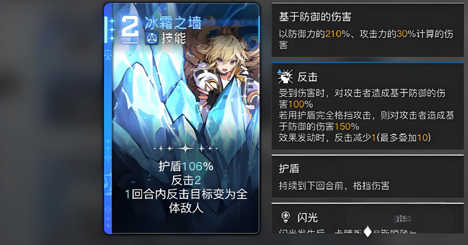 5、冰壁可强化反击效果,使1回合内反击目标变为全体敌人,同时提升大招伤害,大招伤害随反击次数增加,实战中能稳定打出高额数值。