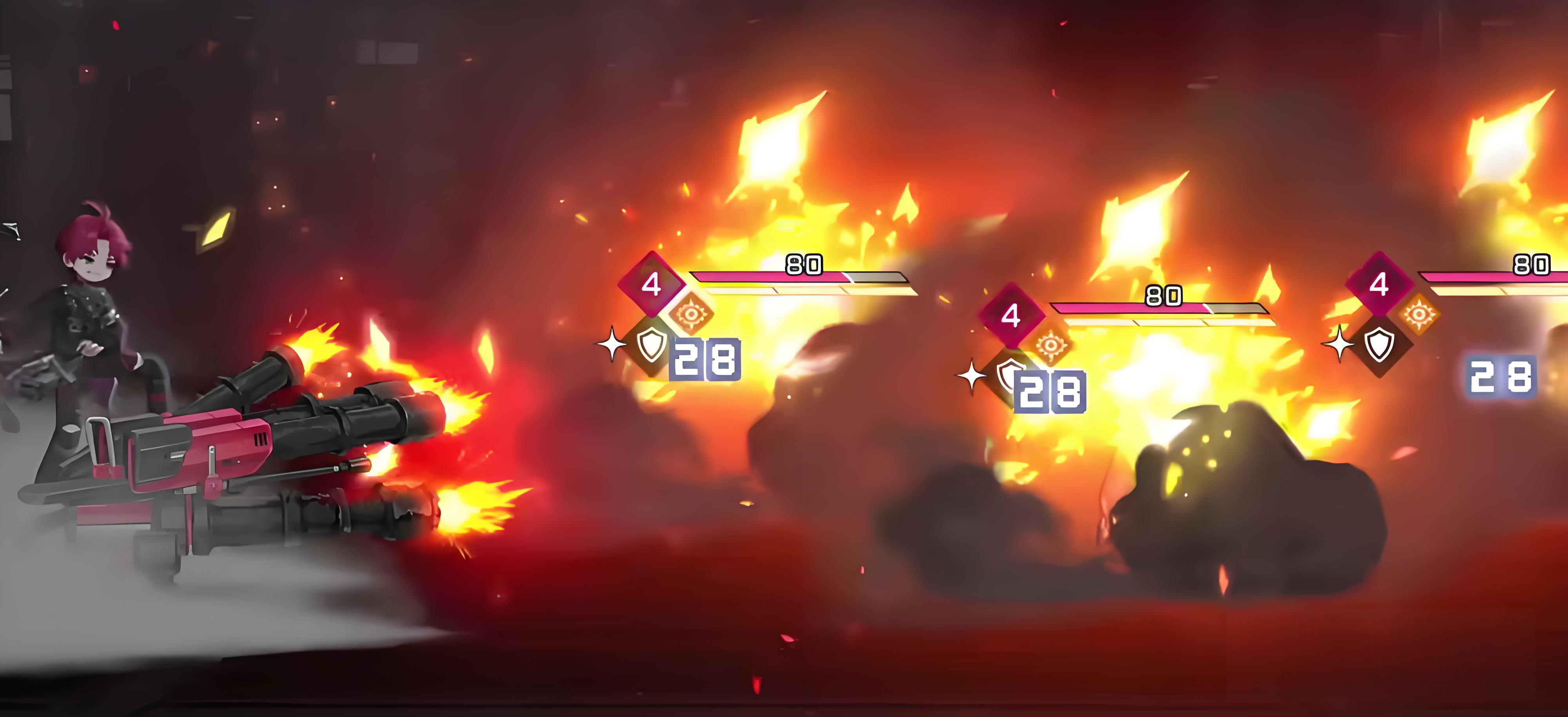2、关键技能各有侧重,火焰斩击可对全体敌人造成范围伤害,全弹发射能触发大范围爆炸实现清屏压制。