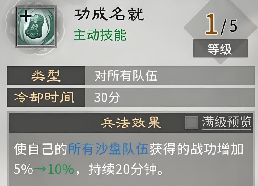 2、功成名就为战功加成技能,战斗后给沙盘队伍增加战功收益,冷却后可重复使用,高频战斗收益显著,助力提升排名获取更多奖励。