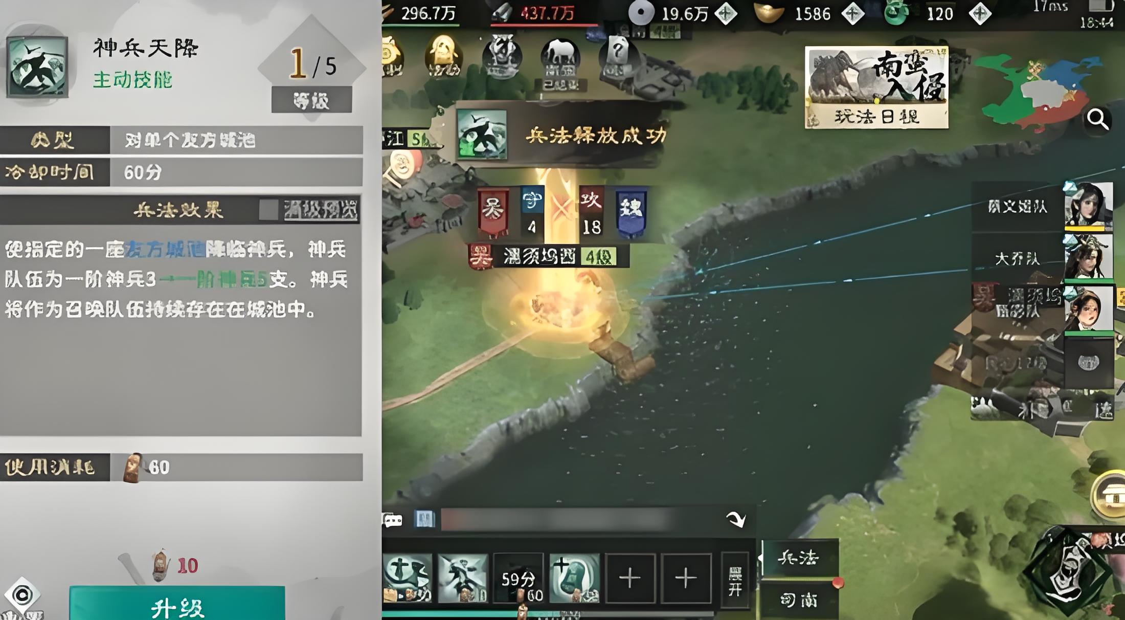 3、神兵天降属灵系支援技能,给友方城池召唤神兵增援,增强防守能力为反攻争取时间,联盟协同作战中可发挥关键支援作用。