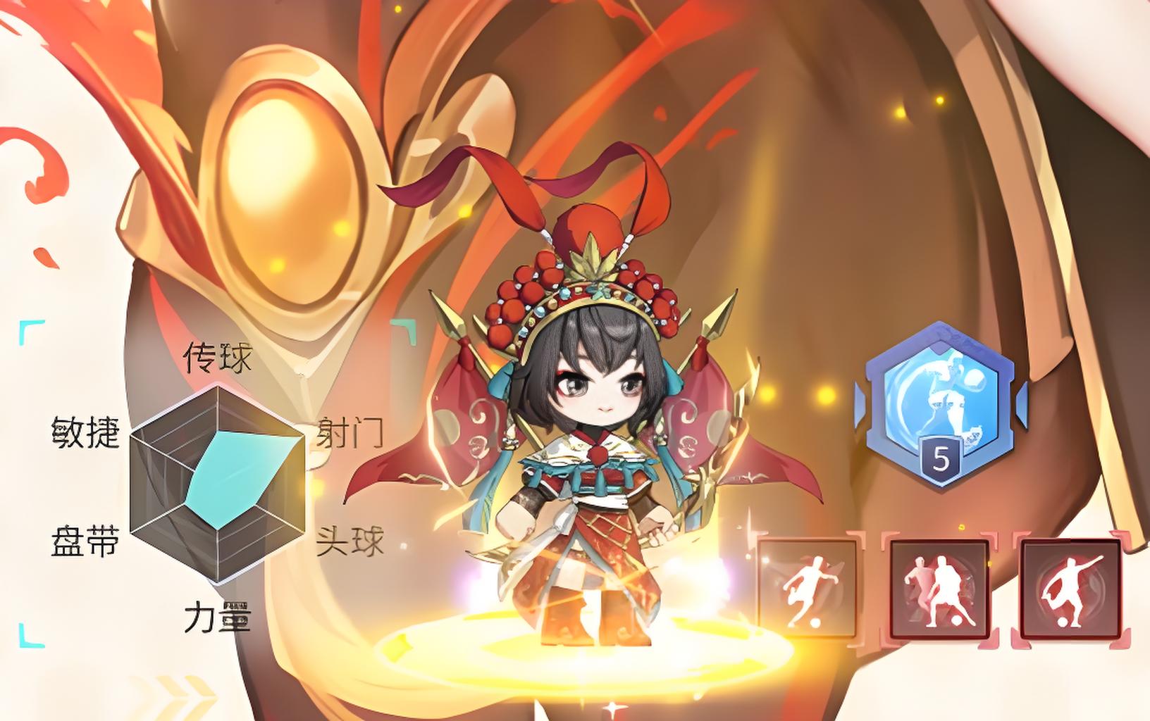 1、穆桂英任前锋主打输出,专属技能曲线射门提升20%进球概率,无视防守干扰,未命中也能增加敌方守门员10%失手概率。