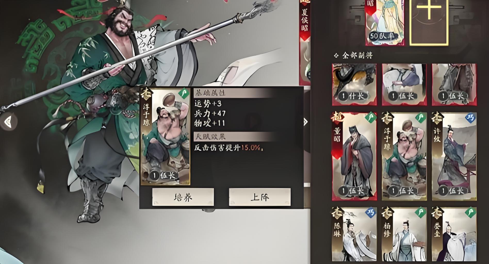 5、与夏侯惇组合是经典开荒搭配,可协同其他副将提升反伤属性,无克制问题适配前期开荒需求。
