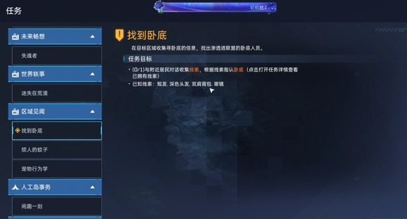 有的NPC需要回答问题,有的需要提交材料的,完成一个任务获得一个线索。最后根据短发,深色头发,双肩背包,眼镜这些线索。
