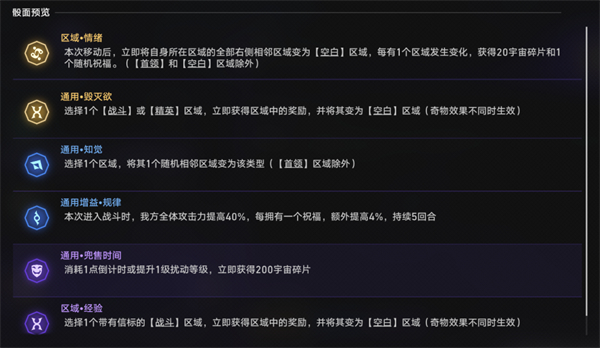 3、推荐骰面:【[区域·情绪]、[通用·毁灭欲]、[通用·知觉]、[通用增益·规律]、[通用·兜售时间]、[区域·经验]】。
