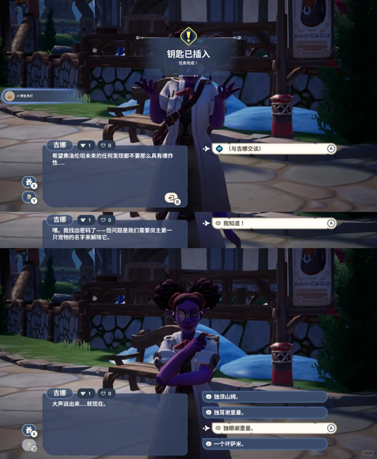 在自己地块发现了一把钥匙,与“耶尔、艾希、肯利、缇茜、阿舒亚(说出第一任主人的宠物名字)”对话后,找吉娜对话,选择“独眼谢里曼”完成任务。