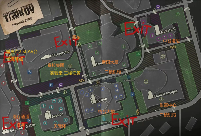 逃离塔科夫Ground Zero地图资料。不少玩家可能还不太清楚这张新地图的撤离点位置,下面带来具体的介绍,供各位玩家们参考。