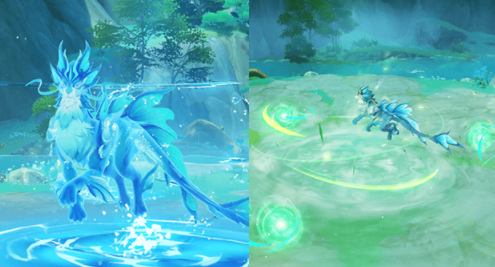 栖息于深山中的仙兽,能够同时驱使水元素与风元素进行战斗。在其汇集水元素的仙力时将其冻结,再通过碎冰或融化等元素反应将坚冰击碎,能使其暂时陷入无法行动的状态;在其汇集风元素的仙力时,通过能与风元素反应的元素类型的攻击,击破其唤出的灵风珠,也能取得同样的优势。
