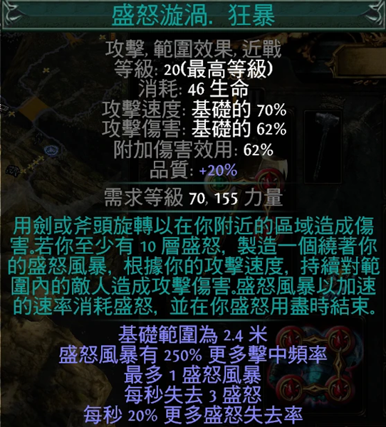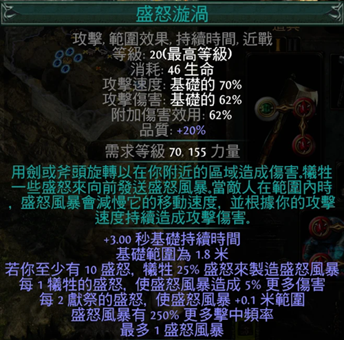 改造版,62%伤害倍率,0.7攻速,漩涡250%更多攻击频率,1*0.62*0.7*3.5,约为150%倍率,在近战技能里属于非常低的伤害倍率了,他优点是可以持续输出,边走边打,范围大,而且可以持续享受战吼收益,只能说凑合能玩。