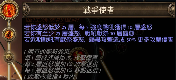 当你怒气高于25点,施放战吼后4秒内,消耗战吼层数的攻击,可获得50%more伤害加成。