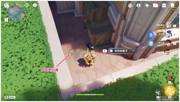 第二处污迹在屋子后面,同样沿着屋子左边的缝隙过去清理即可。
