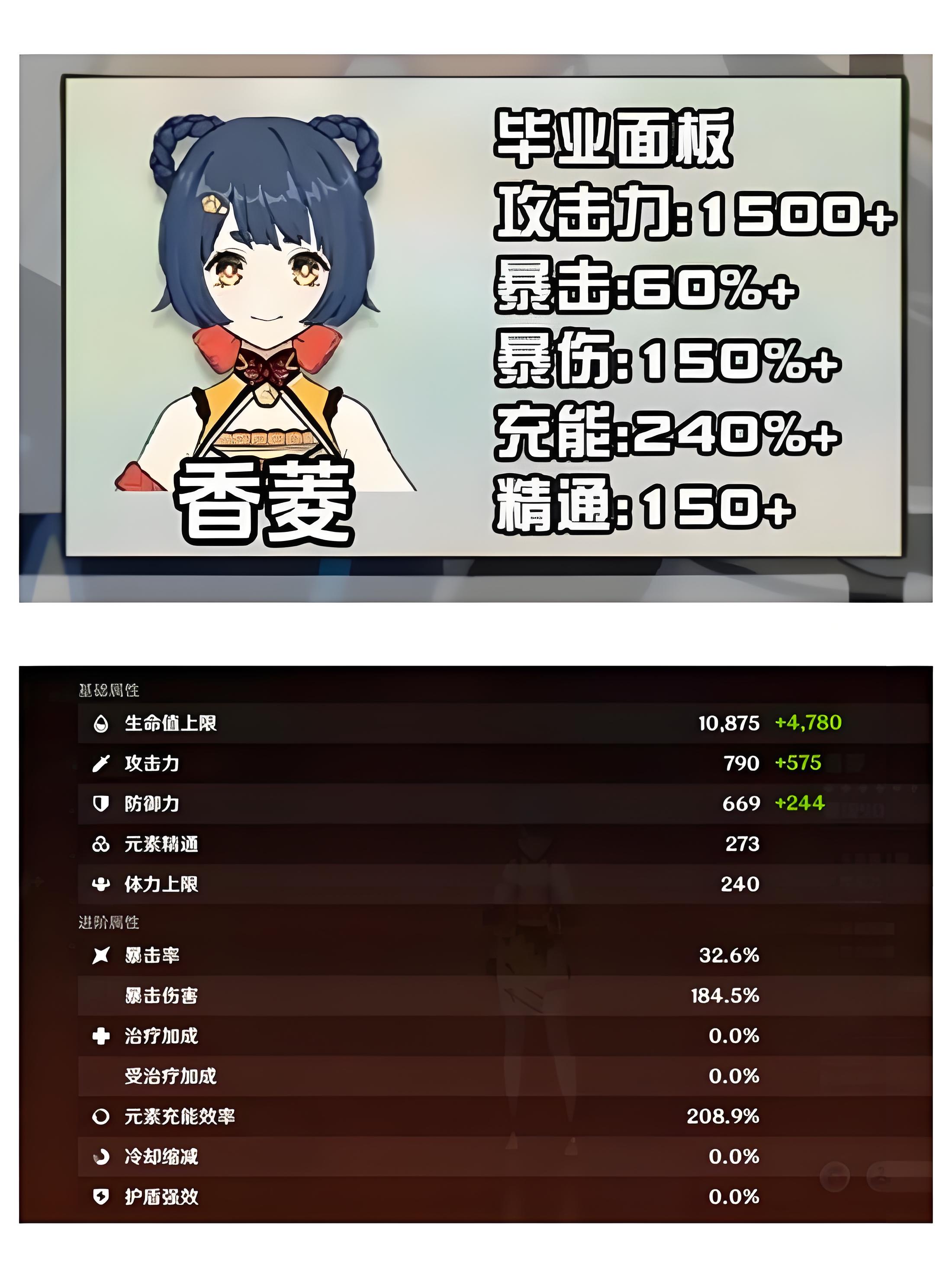 1、毕业面板需攻击力1500以上,暴击60%以上暴伤150%以上,充能240%以上精通150以上,元素充能不能低于200%。