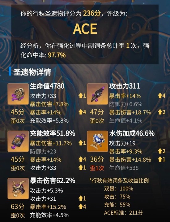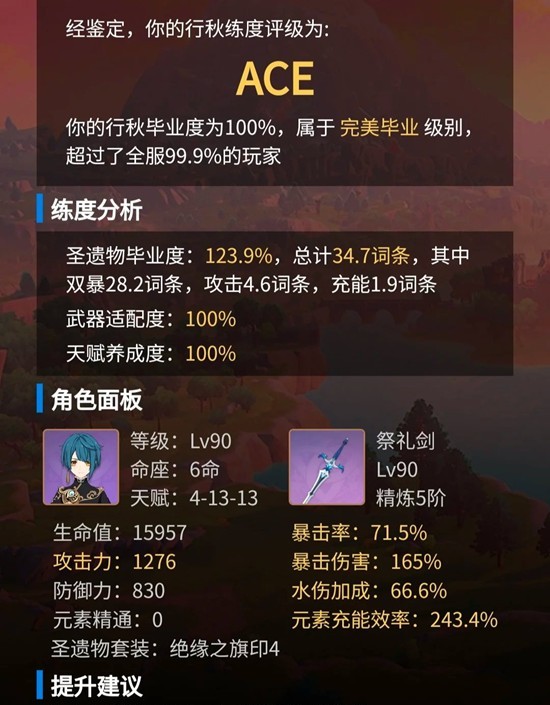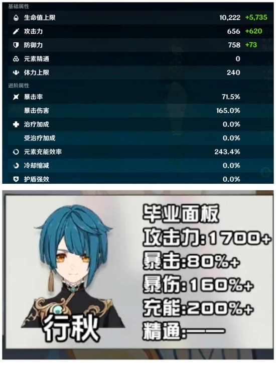 3、毕业面板要达到攻击力1700以上,暴击率80以上,暴击伤害160以上,元素充能200以上且不可低于此充能数值。