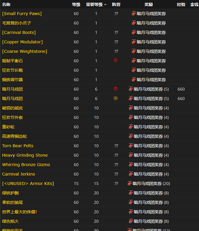 "暗月马戏团奖券"是在暗月马戏团内部使用的一种货币,玩家可以通过完成NPC任务来获取。目前,25级是马戏团奖券任务的封顶等级,玩家可以选择完成这些任务来获取奖券。