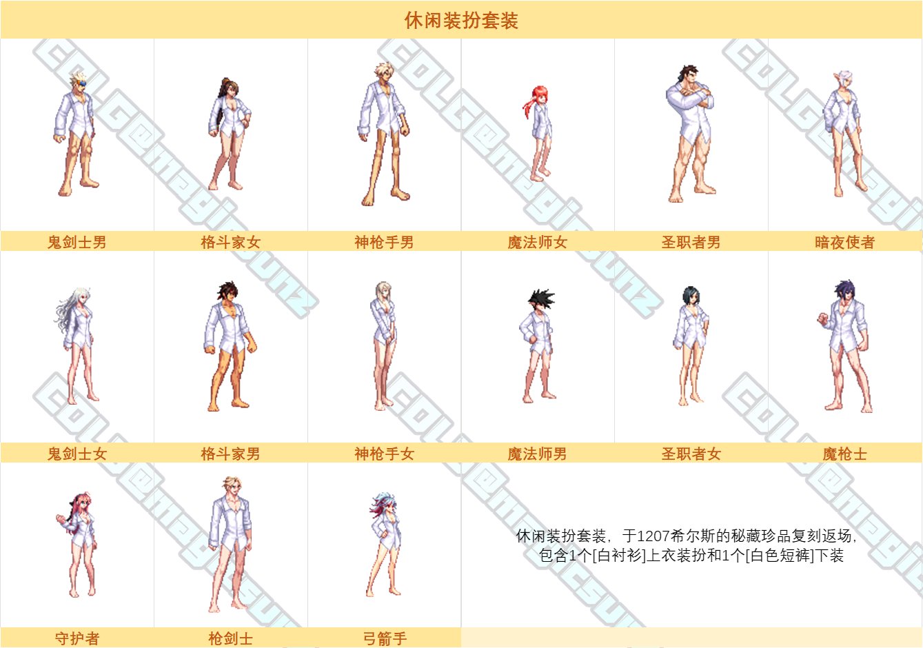dnf休闲装扮套装自选礼盒可以获得慵懒白衬衫和纯净白色短裤时装,全职业外观可以见上图,希望对大家有所帮助。