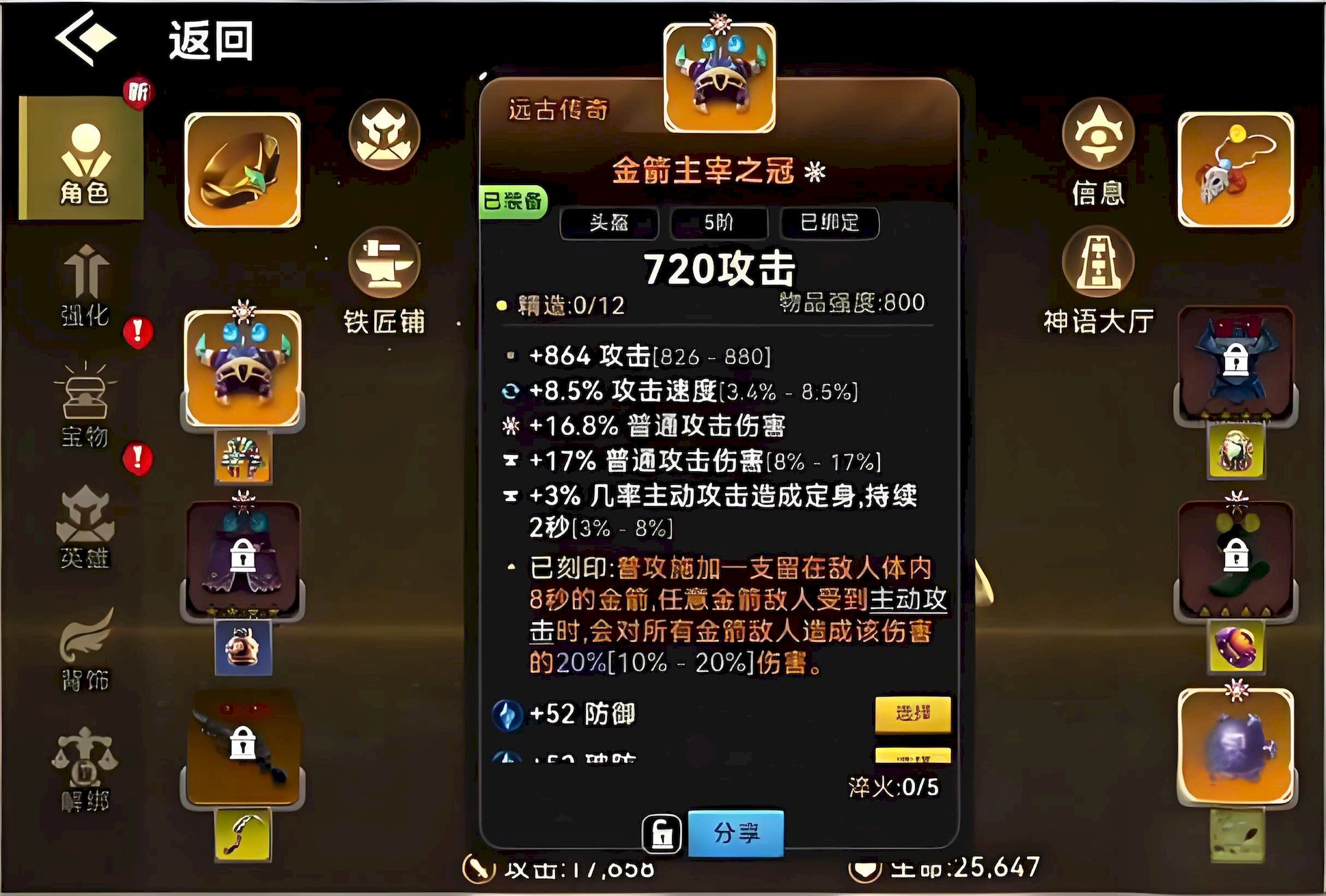 3、需对猎手玉扳指进行刻印,其刻印后可提升20%普攻攻速与9%普攻伤害,还能让普攻施加金箭触发额外群体伤害。