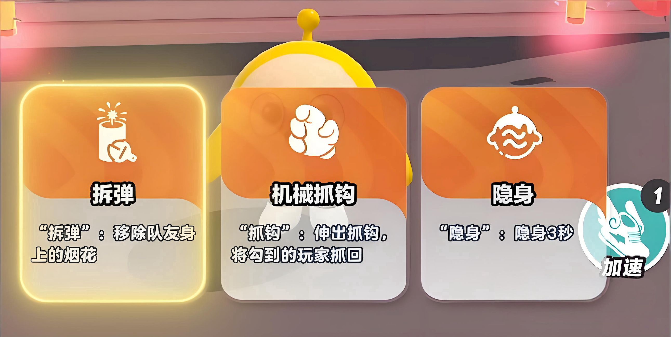 4、模式内有多种实用技能,隐身可隐藏身形三秒,拆弹能移除队友身上烟花,抓钩可将远处玩家抓回。