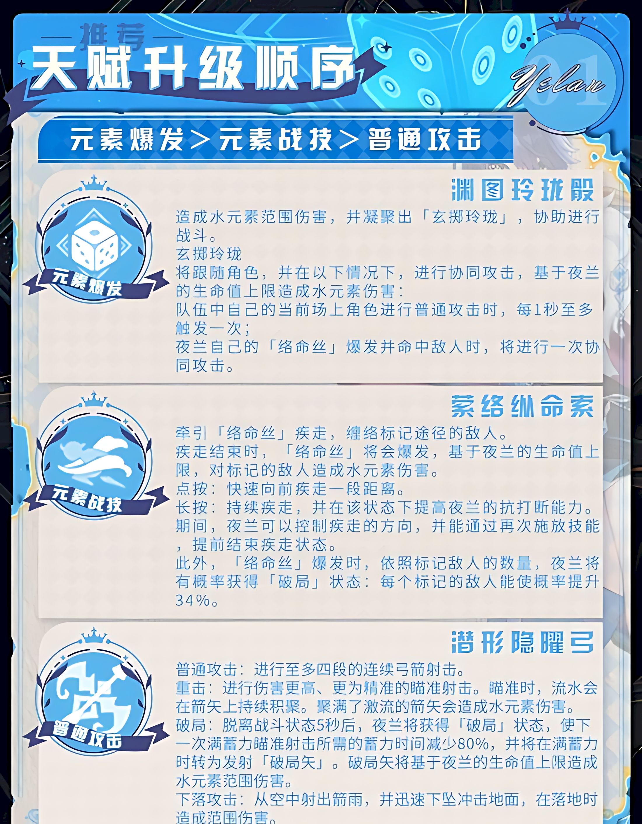 原神的夜兰是实力出众的水元素输出角色,培养核心紧紧聚焦生命值提升,其天赋技能的伤害结算、命座的增益效果、武器的属性契合及圣遗物的套装加成均需围绕这一核心推进。本文将系统梳理天赋升级优先级、关键命座作用、推荐装备选择与实用阵容搭配,帮大家理清培养逻辑高效发挥其战场输出价值。
