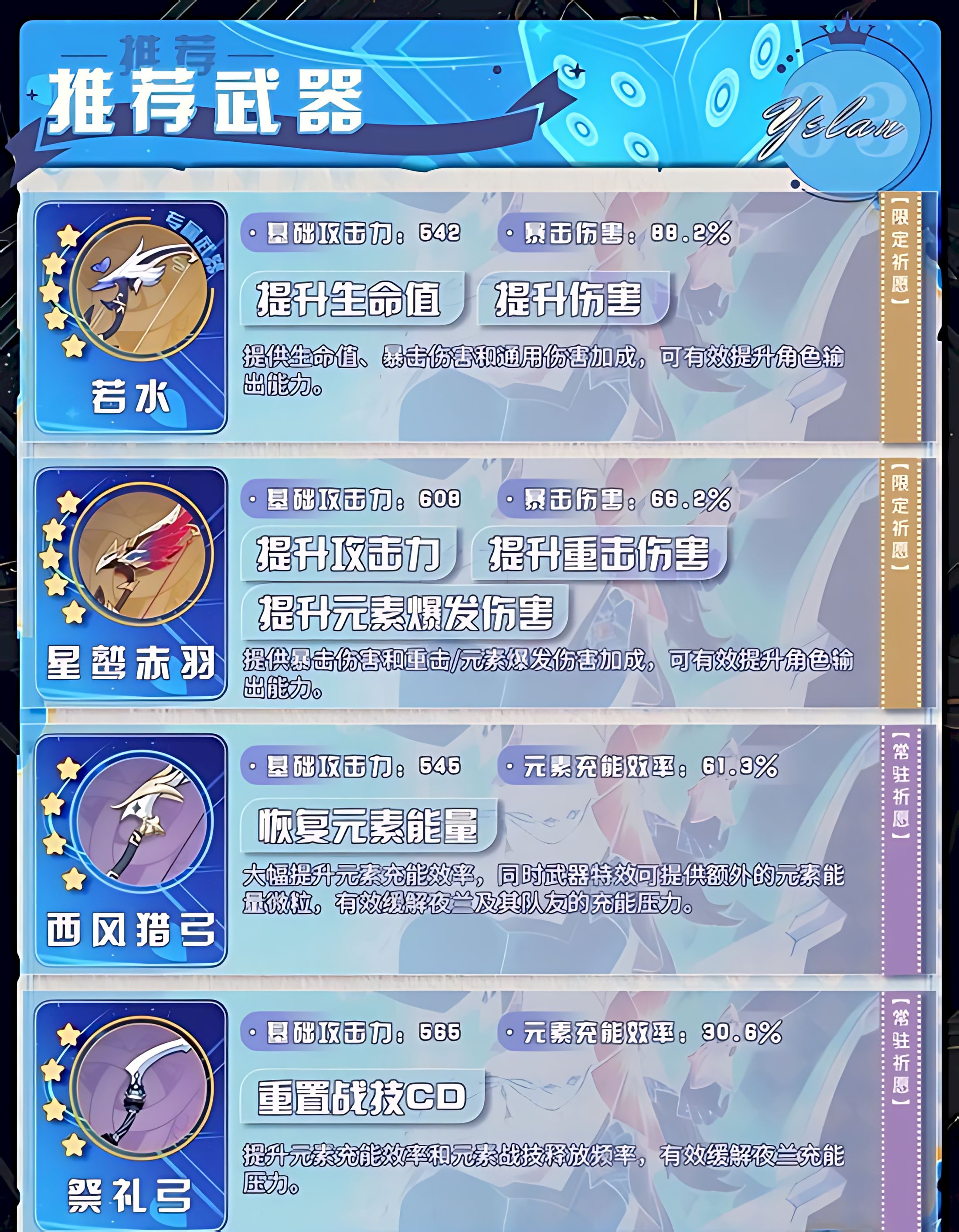3、推荐武器涵盖若水星鹫赤羽等,分别提供生命值暴击伤害加成,西风猎弓祭礼弓可有效缓解充能压力。