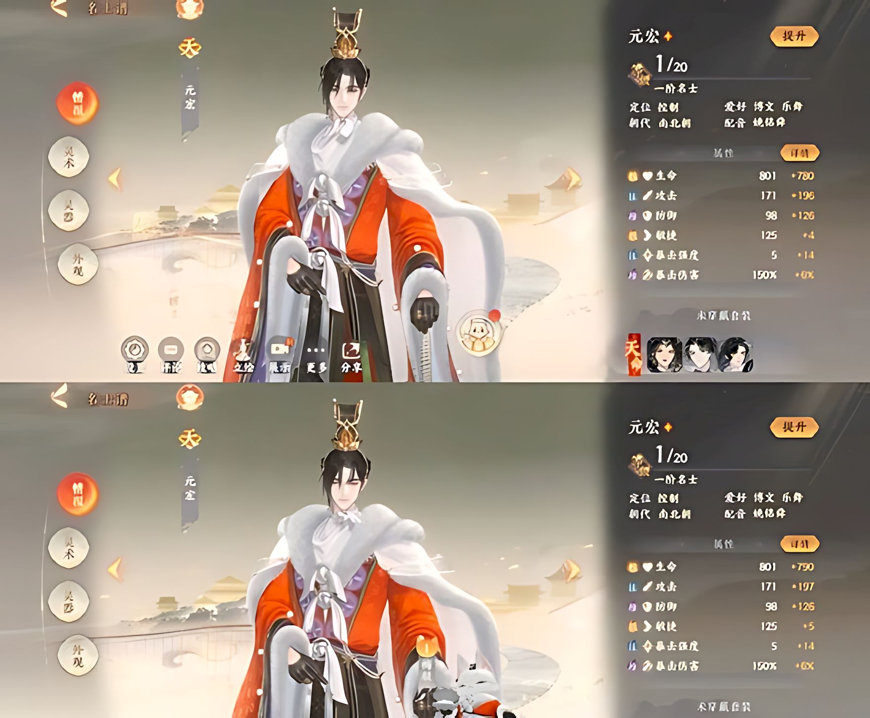 1、定位与基础属性清晰,身为控制类名士,基础涵盖生命攻击防御敏捷等属性,暴击强度与暴击伤害固定,敏捷需重点强化。