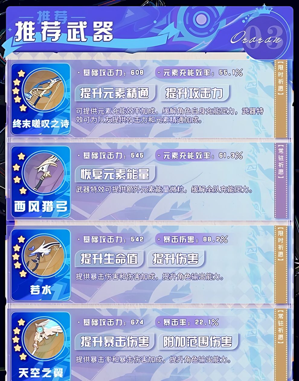 2、推荐武器包括终末嗟叹之诗,提供元素充能效率还能为队友增攻与元素精通,西风猎弓可产出额外元素能量微粒缓解全队充能压力。
